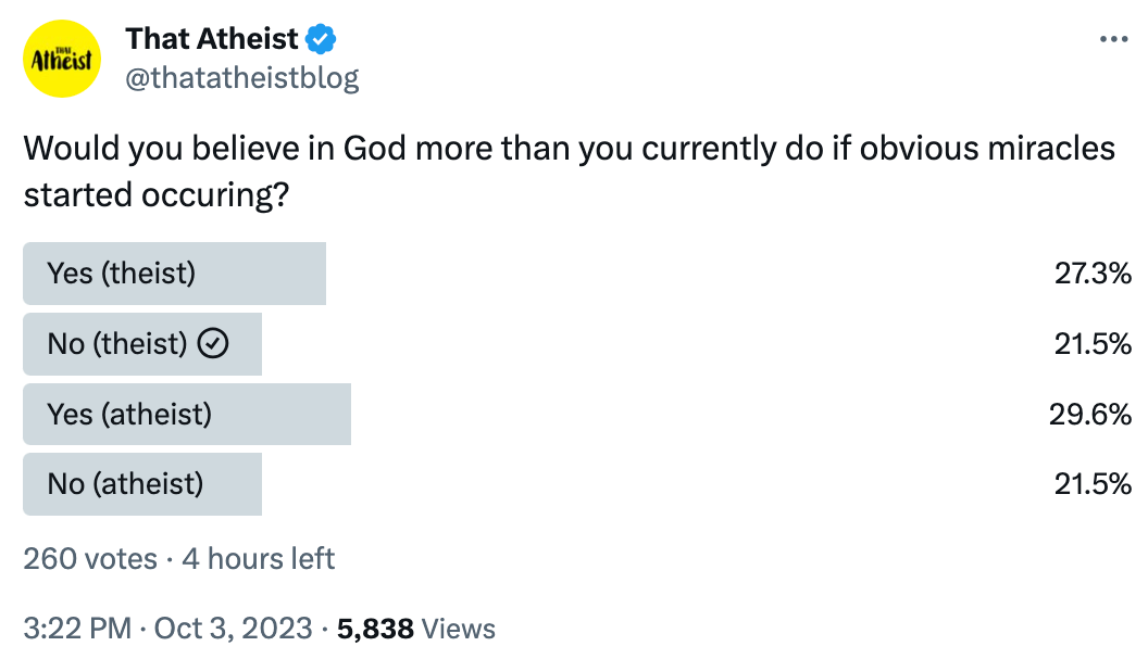 About 42% of atheists responding to this poll say they would not believe in God more if obvious miracles started occurring.